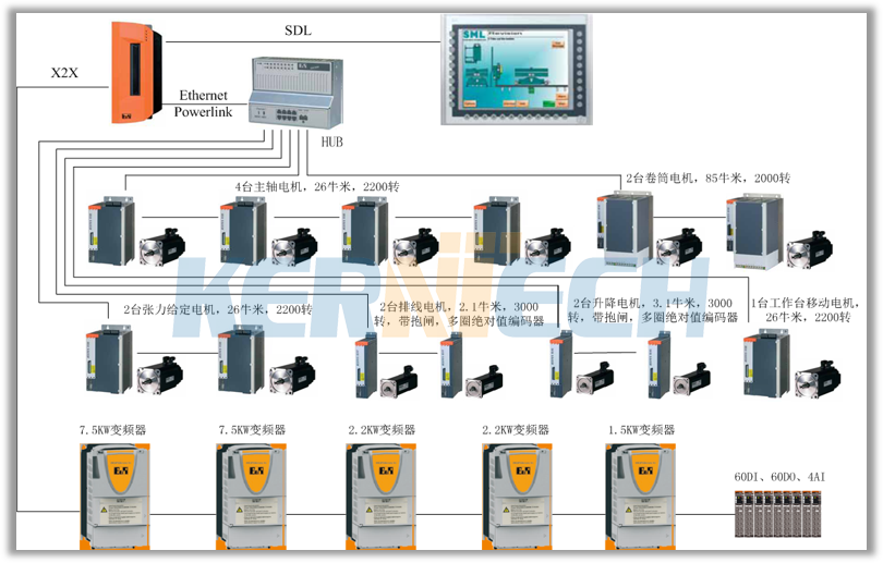 13軸貝加萊伺服作為設備的運動控制機構,其中4軸作為主軸要進行同步控制帶動鋼線正反運動,2軸同步運動帶動主軸升降,2軸工作于力矩模式進行張力給定,2軸用于鋼線的收放線,通過程序智能計算卷徑并完成鋼線的閉環張力控制,2軸用于收放卷的自動排線,1軸用于工作臺的進退。5臺變頻器帶動電機完成切割的附屬功能,主要用于砂漿的攪拌、供給及回收。