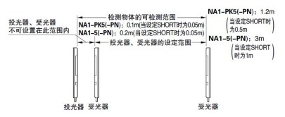 (注2): 檢測距離是在投光器和受光器之間可設定的范圍。檢測物體的可檢測范圍、NA1-PK5(-PN):0.1m(當設定SHORT時為0.05m),NA1-5(-PN):0.2m(當設定SHORT時為0.05m)