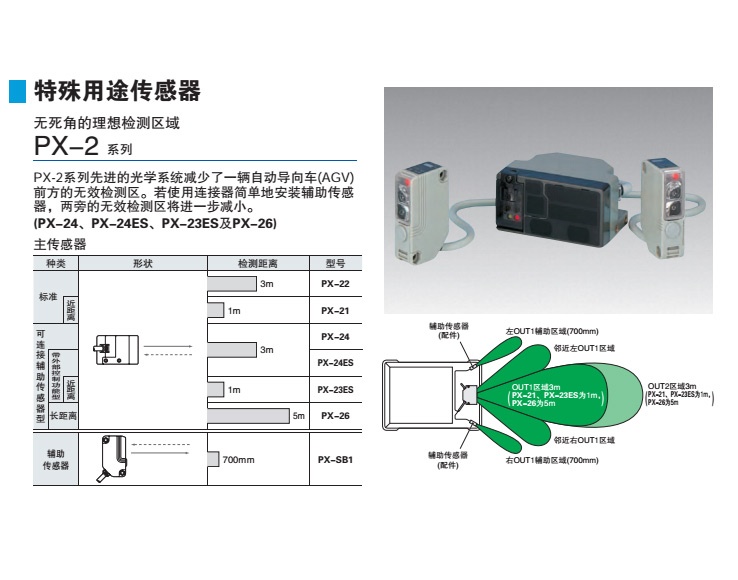 PX-2列先進(jìn)的光學(xué)系統(tǒng)減少了一輛自動(dòng)導(dǎo)向車(AGV)前方的無(wú)效檢測(cè)區(qū)。若使用連接器簡(jiǎn)單地安裝輔助傳感器,兩旁的無(wú)效檢測(cè)區(qū)將進(jìn)一步減小。