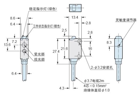 采用定制的專用IC集成電路和光學設計,與通用光電傳感器體積減少約67%(透過型)、58%(反射型)。