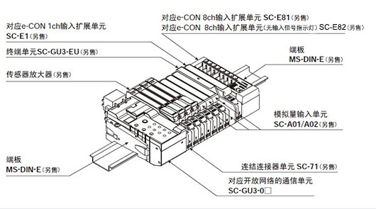 一般的通用傳感器與連接器輸入單元SC-A01、SC-A02、SC-E1、SC-E81、SC-E82相連后,也可連接到SC-GU3系列上。進一步實現省配線。