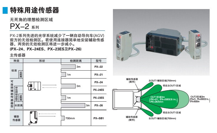 PX-2列先進的光學系統減少了一輛自動導向車(AGV)前方的無效檢測區。若使用連接器簡單地安裝輔助傳感器,兩旁的無效檢測區將進一步減小。